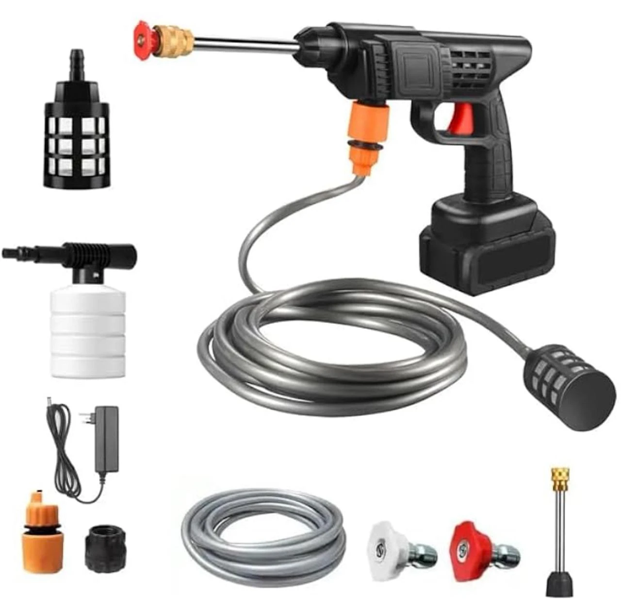 Rechargeable water pump for car washing, garden watering, tree spraying, and hard-to-reach areas around the house. Includes 2 batteries.